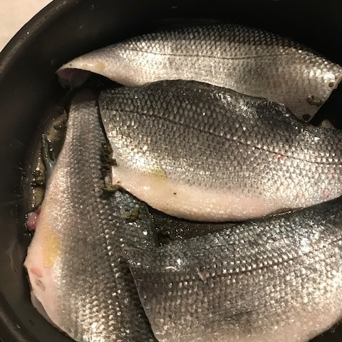 Затем выключить огонь и добавить масло. Пару ложек. На смесь из масла и ароматной соли уложить филе сибаса шкуркой вверх.